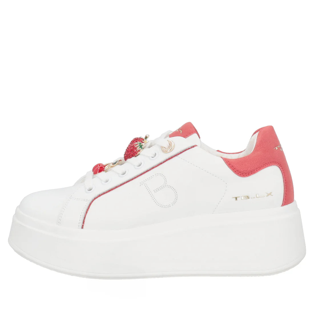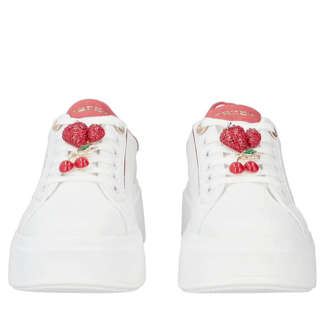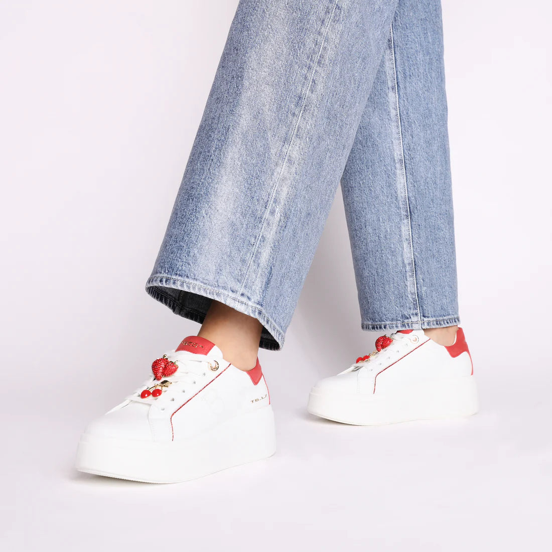 Aggiungi un tocco giocoso al tuo guardaroba indossando le sneakers in pelle con accessori di colore bianco e rosso della nuova collezione Tosca Blu. Realizzate in morbida pelle bianca, presentano una suola platform alta 5 cm che slancia la tua silhouette assicurandoti il massimo comfort. Gli accessori gioiello a forma di frutta e i dettagli in contrasto colore rendono queste sneakers in pelle la scelta perfetta per completare con uno stile inconfondibile i tuoi daily look.